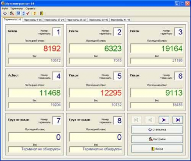 В режиме реального времени программа отображает текущее значение веса и величину последнего отвеса для каждого весового терминала.